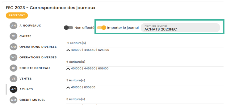 Les opérations actuellement dans le journal 'Achats' seront importées dans un sous-journal 'ACHATS 2023FEC'.
