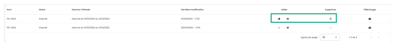 Pour supprimer un import, cliquez sur le bouton Corbeille.