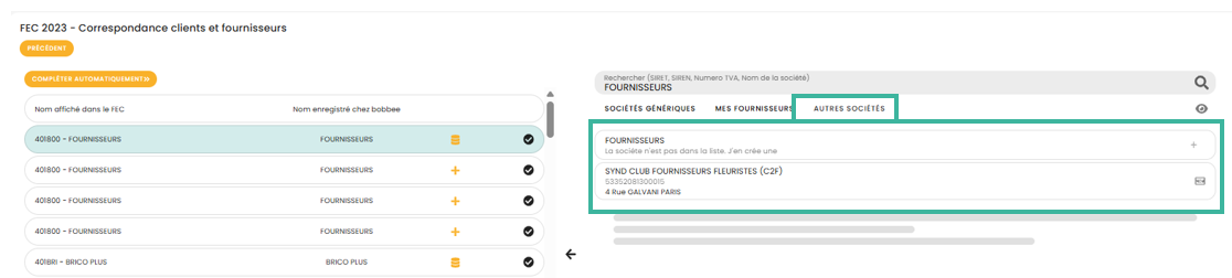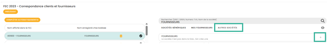 - Traiter manuellement chaque ligne : positionnez-vous sur chaque ligne, puis allez dans ‘Autres sociétés’ pour retrouver le tiers concerné dans la liste fournie par bobbee (base de données de l’INSEE).
