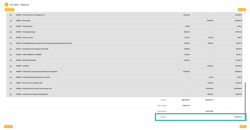 Vous pouvez visualiser l’ensemble des comptes ainsi que les totaux qui vont être importés. Vérifiez le résultat comptable à l’aide de la balance générée depuis le logiciel de provenance du FEC.