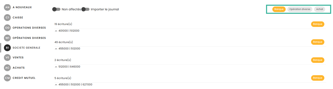 Vous pouvez affecter toutes les écritures à un journal en désélectionnant les autres journaux dans l’en-tête (les journaux non sélectionnés sont grisés) :