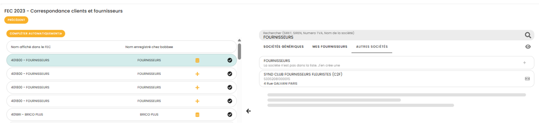 - Effectuer une complétion en automatique : cliquez sur ‘Compléter automatiquement’ afin que bobbee créer en automatique les fiches tiers.