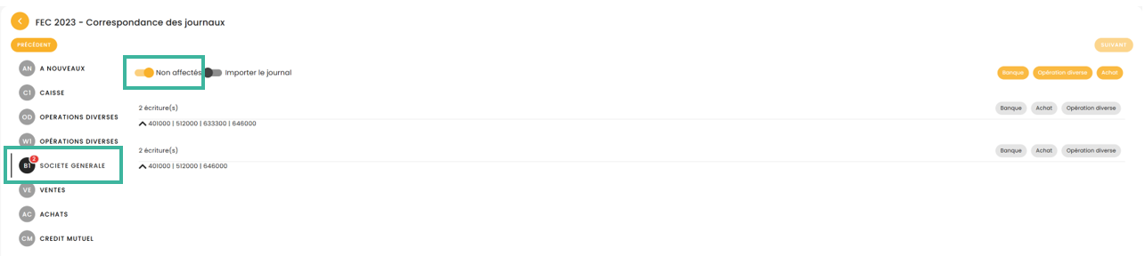 Pour une écriture en anomalie, cliquez sur l’une des pastilles en bout de ligne pour l’affecter au journal correspondant (Banque, Achat ou Opération diverse).