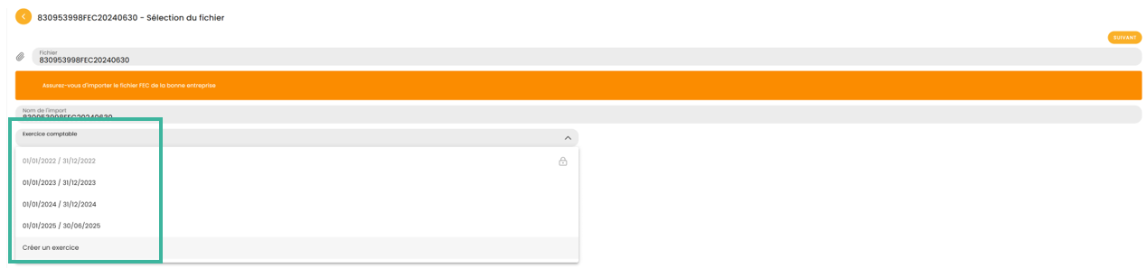 Le nom de l’import s’alimente automatiquement, mais il reste modifiable. Sélectionnez ou créez l’exercice comptable concerné.