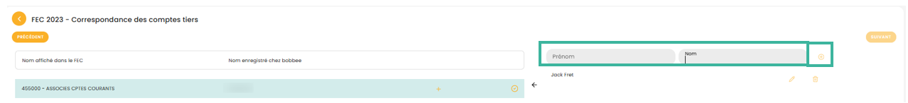 Cliquez sur Suivant pour accéder à la correspondance des comptes de l’exploitant et de certains comptes tiers 108 - 421 - 425 - 455 - 467. Cette étape permet d’individualiser ces comptes et de les associer aux tiers existants dans le dossier.