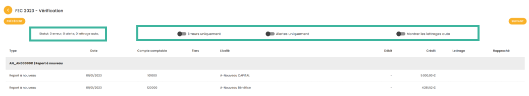 Cette étape permet de vérifier si des anomalies sont présentes. Examinez le statut affiché pour vérifier la présence d’anomalies. Pour accéder facilement aux anomalies, utilisez les filtres prévus et identifiez les points à corriger.