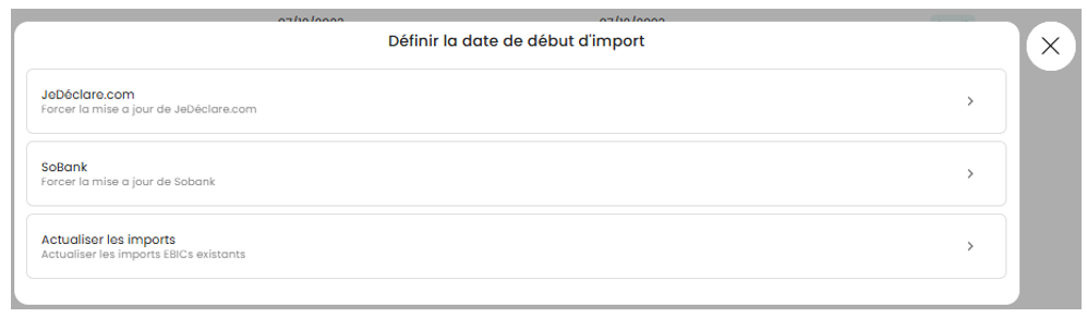 Il est possible de lancer une synchronisation uniquement pour les imports jedeclare.com ou uniquement pour les imports SoBank ou pour tout les imports confondus.