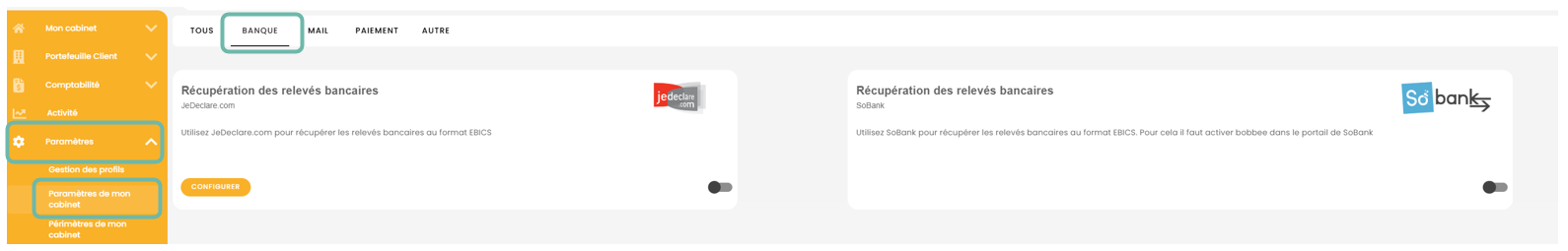Allez dans la Gestion Interne menu Paramètres / Paramètres de mon cabinet / Onglet Banque.
