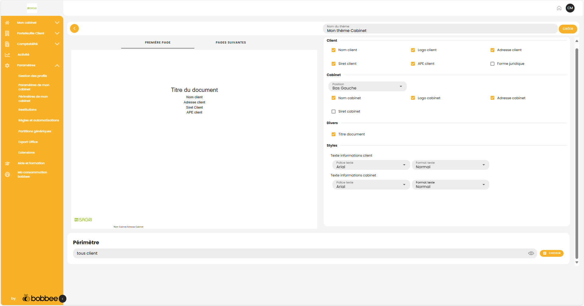 Pour créer un nouveau thème, cliquez sur AJOUTER. Paramétrez votre thème en sélectionnant les rubriques, la police, le format... pour la première page et pour les pages suivantes, puis indiquez le périmètre d’application souhaité et cliquez sur CRÉER.