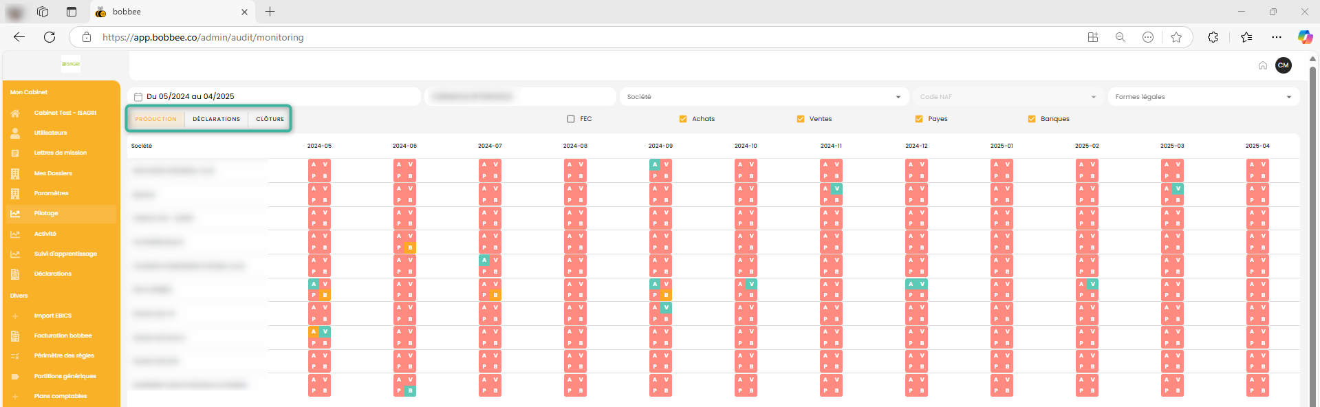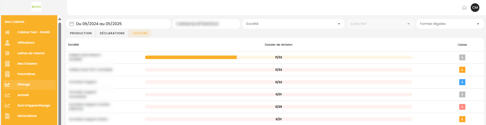 1. Menu Pilotage : permet d’avoir une vue globale sur l’avancement des travaux (production, déclarations et clôture) pour l’ensemble des dossiers du cabinet.