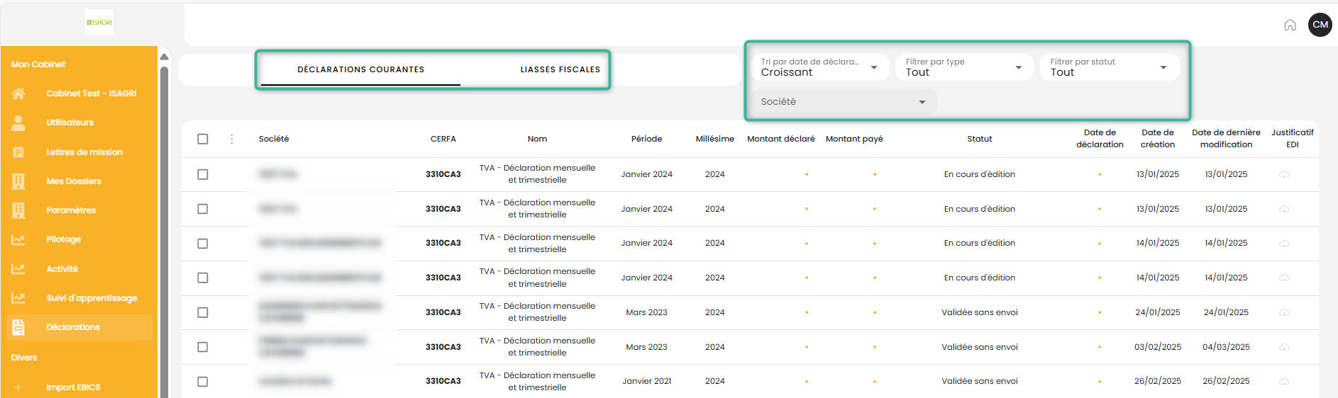 2. Menu Déclarations : permet de visualiser toutes les déclarations et liasses fiscales générées et de consulter les justificatifs EDI correspondant.