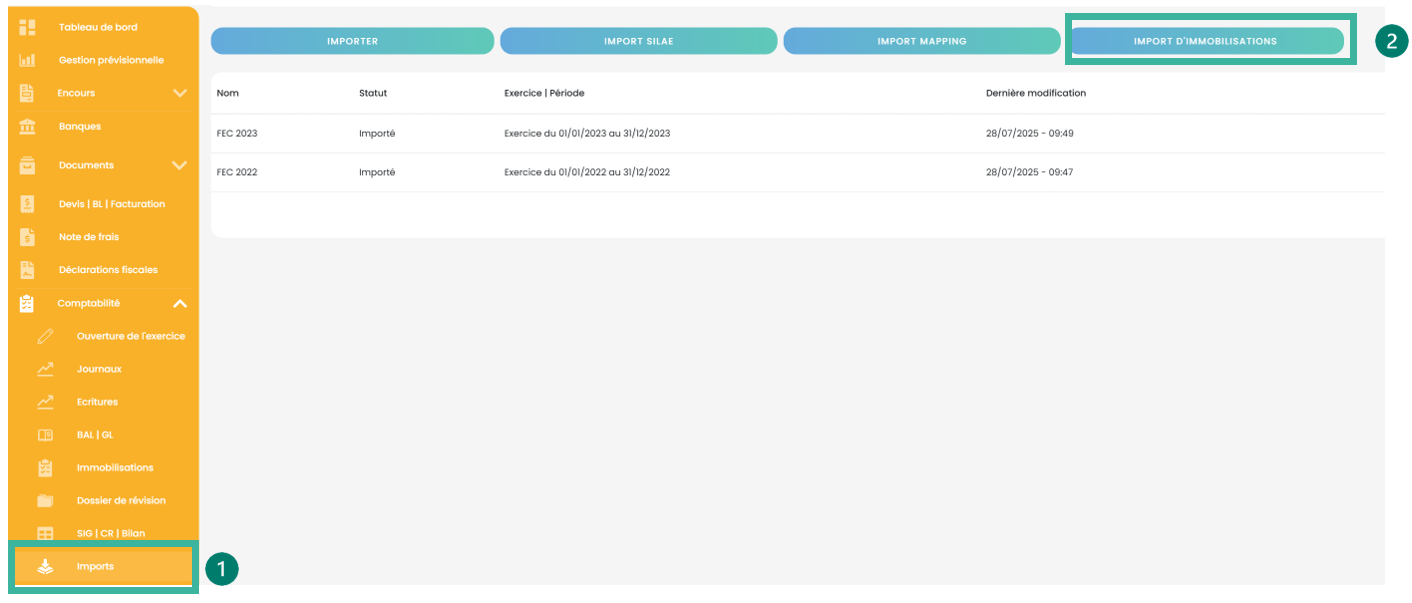 Rendez-vous en Production dans le dossier créé, menu Comptabilité puis Imports / Import d’immobilisations.