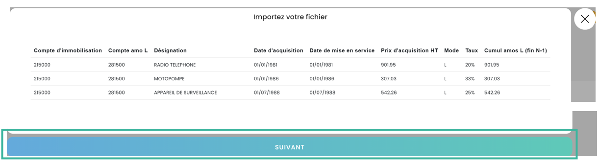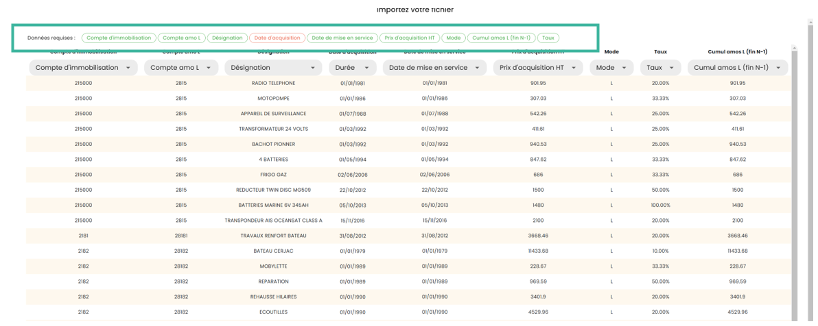 Le fichier d’import doit comporter au moins les colonnes suivantes : Compte d’immobilisation / Compte d’amortissement / Désignation / Date d’acquisition / Date de mise en service / Prix d’acquisition HT / Mode d’amortissement / Cumul d’amortissement fin N-1 / Taux.