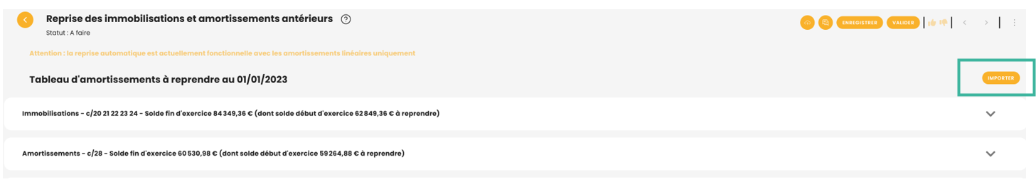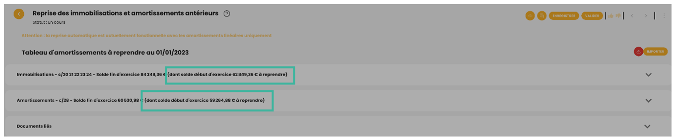 - Le cumul des amortissements doit correspondre au total 'Dont solde début d’exercice à reprendre' de la ligne Amortissements.