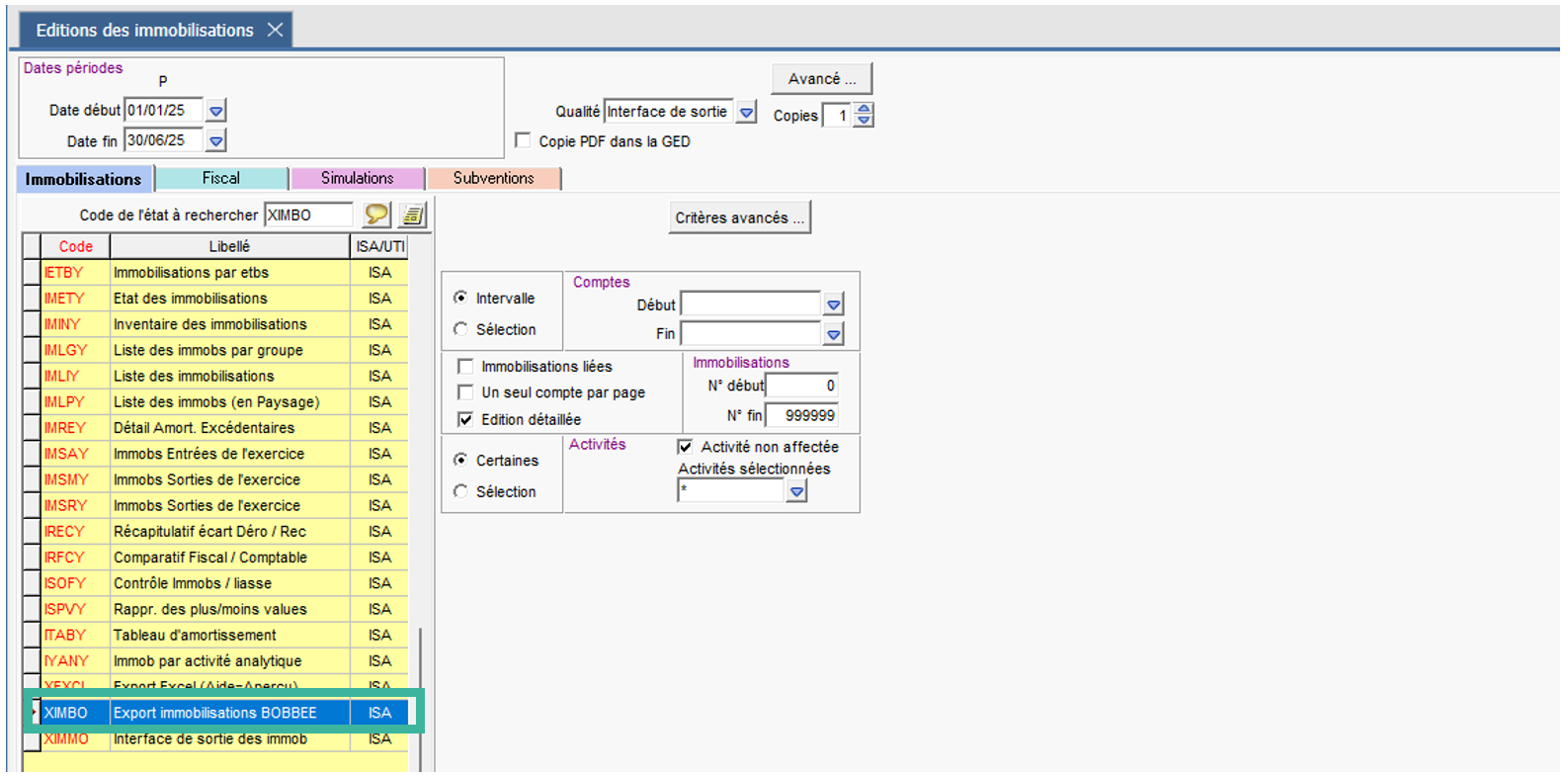 Un export des immobilisations vers bobbee est mis à votre disposition dans ISACOMPTA CONNECT dans le ruban Gestion menu Immobilisations / Consultation / Impression / Etat XIMBO - Export immobilisations bobbee.
